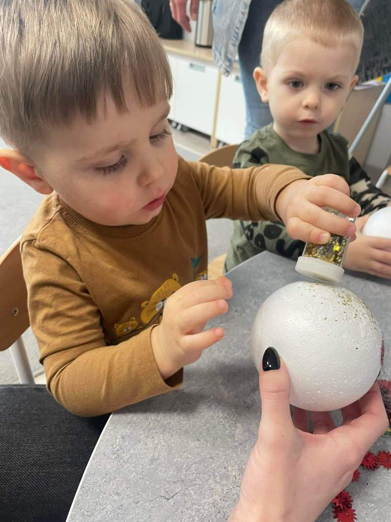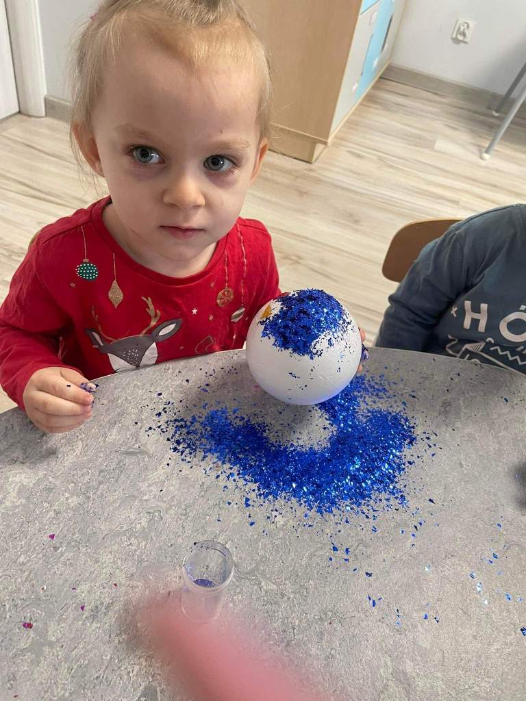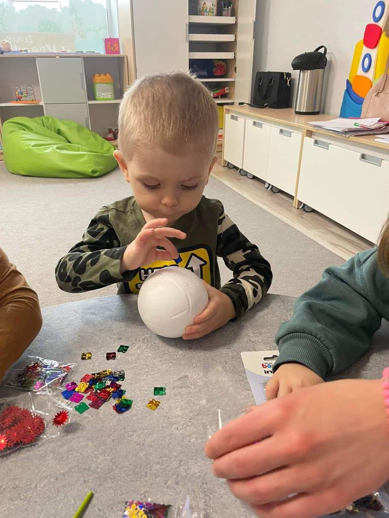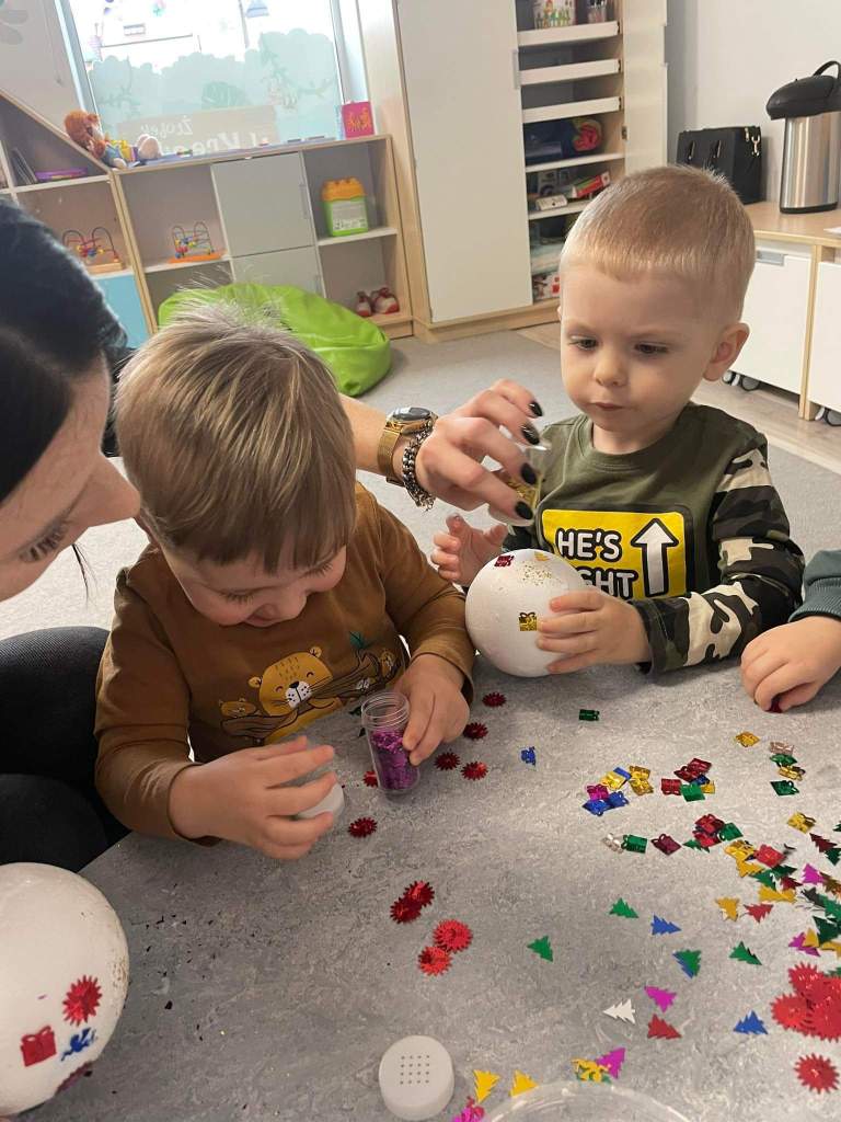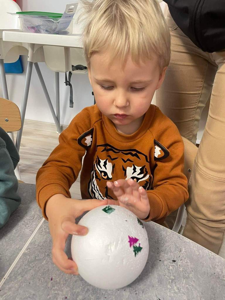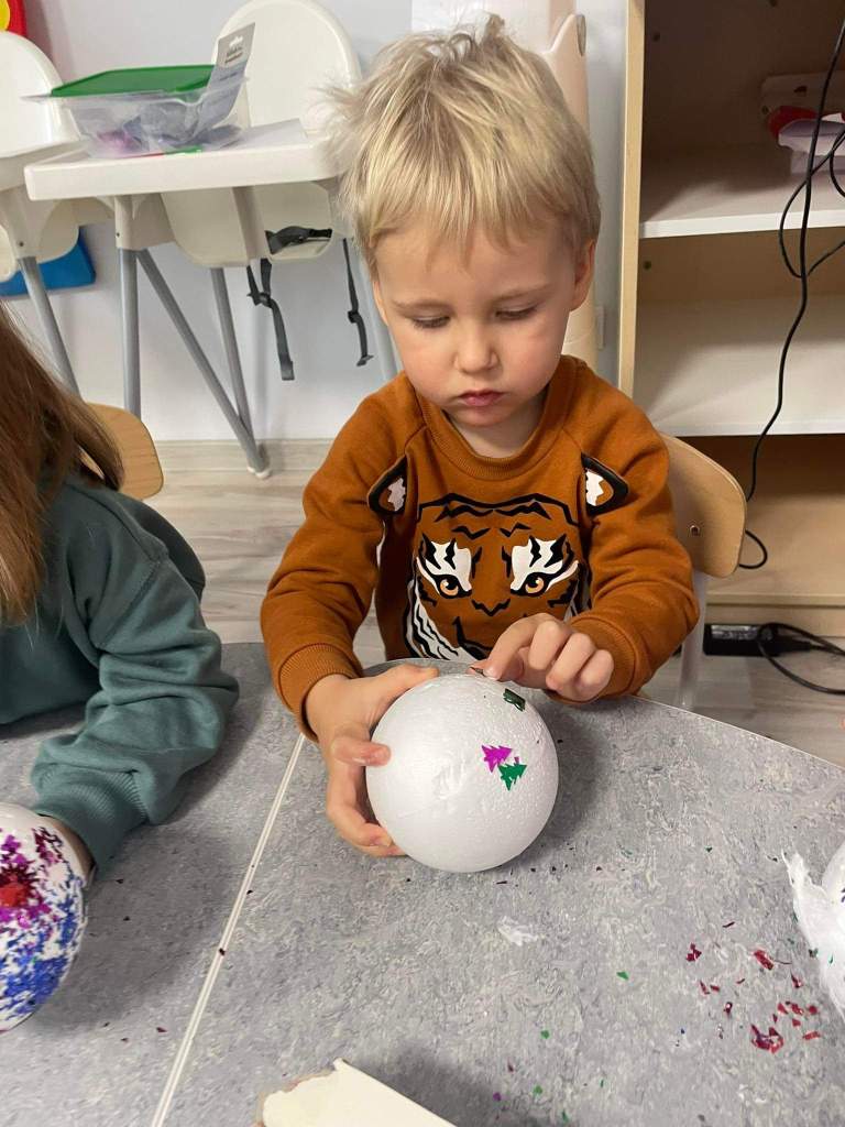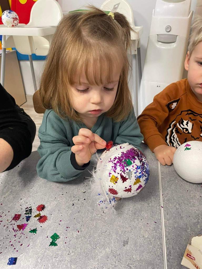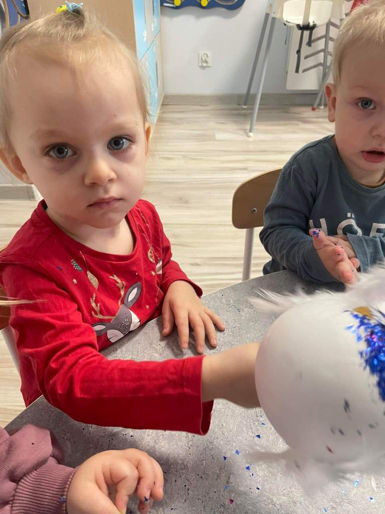 Wczoraj 07.12.2022 w naszym żłobku dzieci pod czujnym okiem opiekunek tworzyły kolorowe bombki.