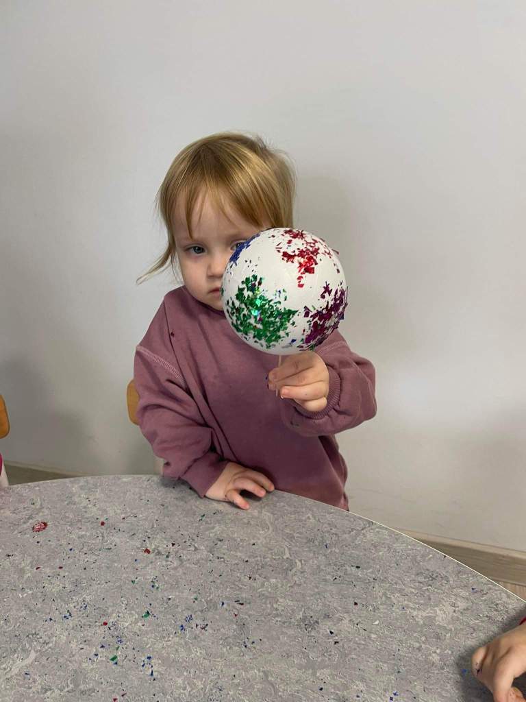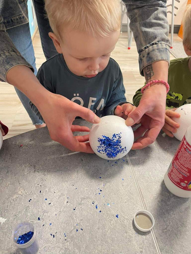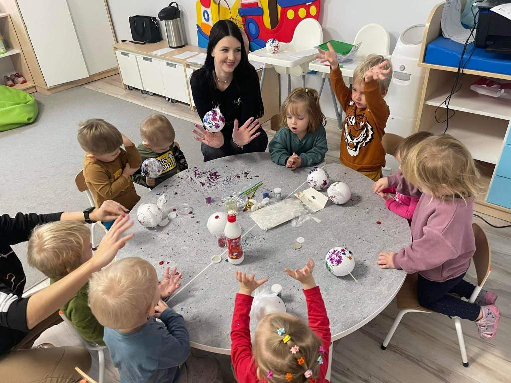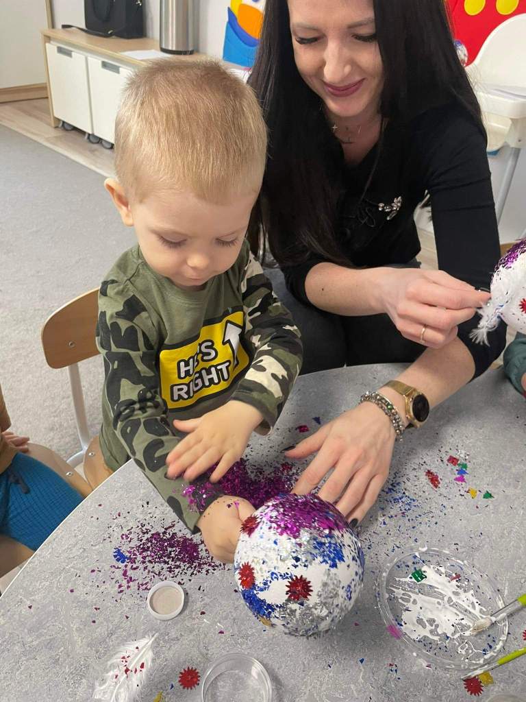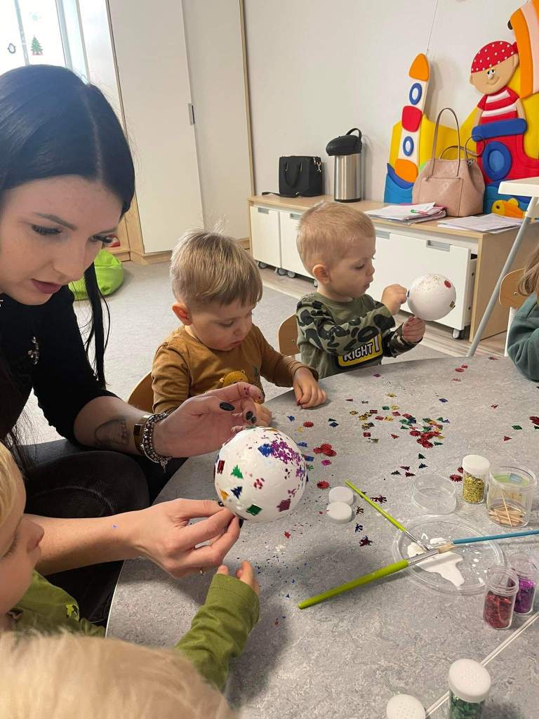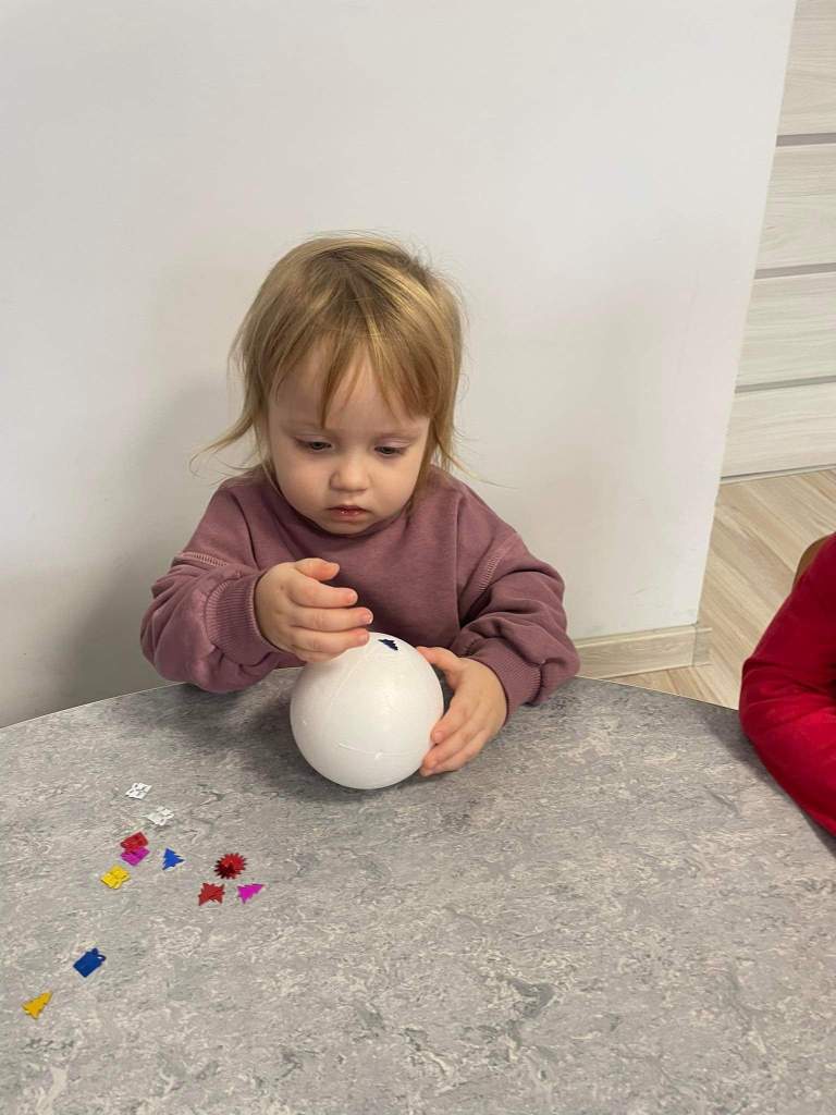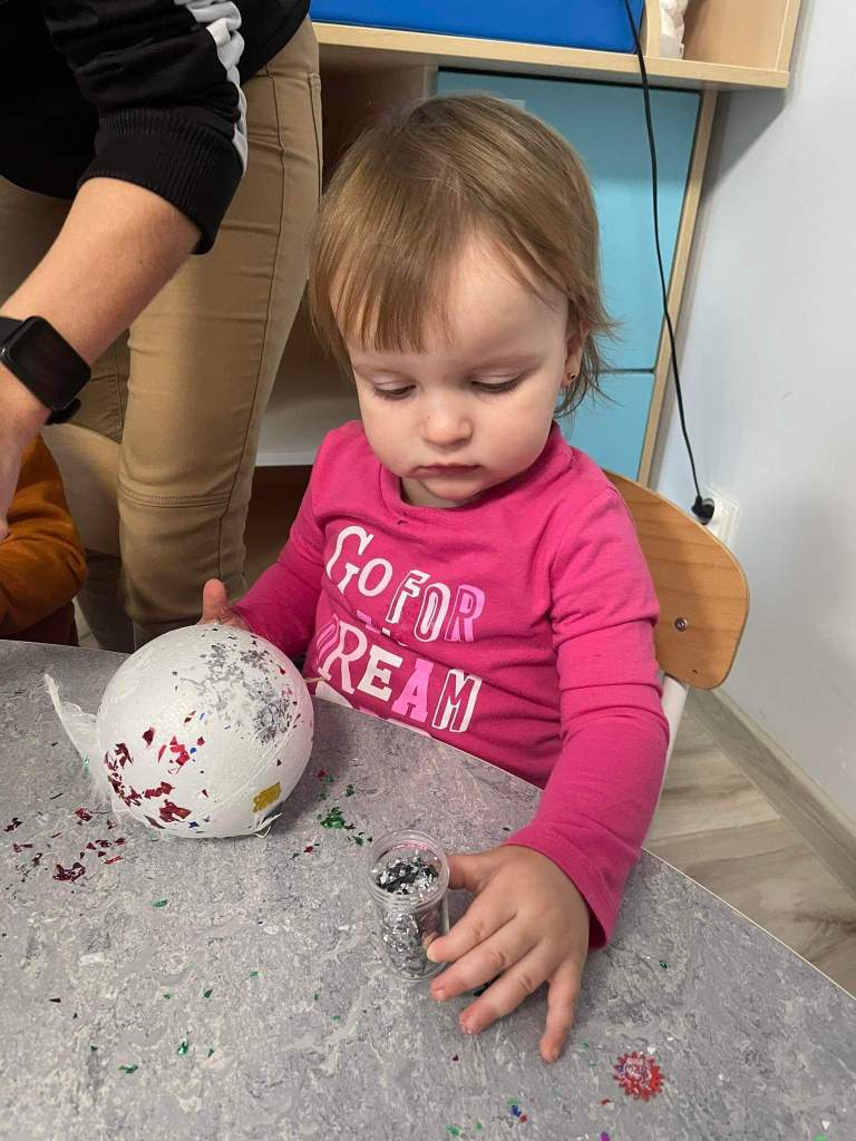 Wczoraj 07.12.2022 w naszym żłobku dzieci pod czujnym okiem opiekunek tworzyły kolorowe bombki.