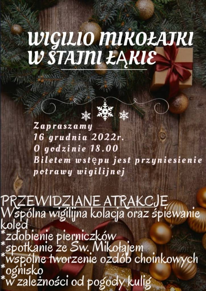 Kochani, już 16 grudnia zapraszamy Was na wspólne Wigilio Mikołajki w Stajni Łąkie. Zaczynamy o 18.00. Biletem wstępu będzie przyniesienie potrawy wigilijnej. Przewidzieliśmy moc atrakcji: wspólna wigilijna kolacja, śpiewanie kolęd, zdobienie pierniczków, spotkanie ze Św. Mikołajem, wspólne tworzenie ozdób choinkowych, ognisko i jeśli pogoda pozwoli kulig.