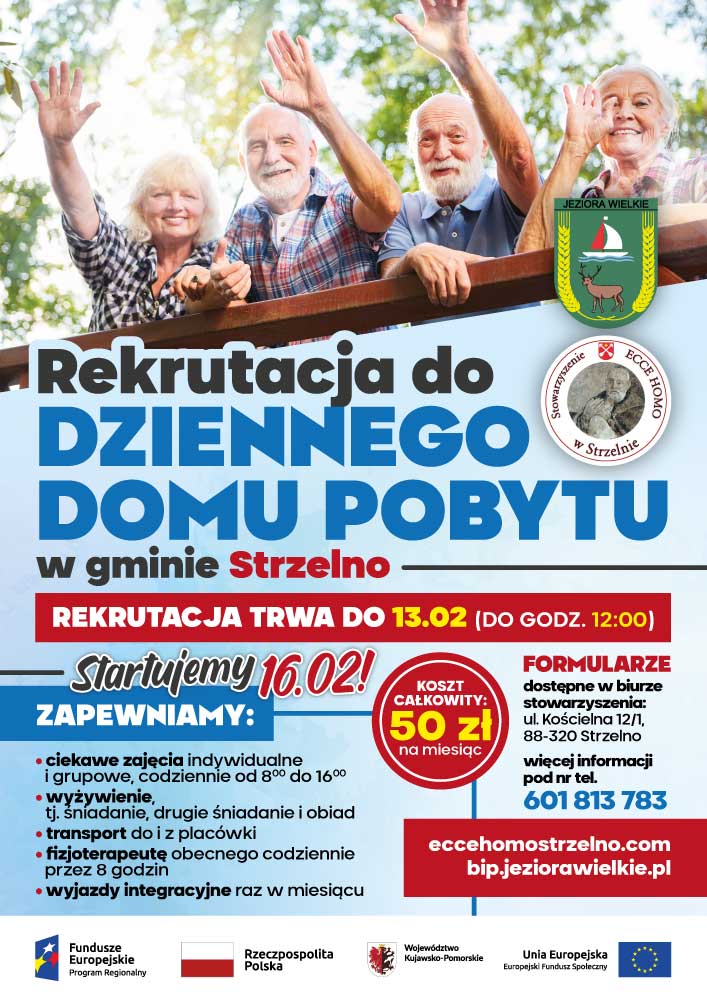 Ruszyła rekrutacja do Dziennego Domu pobytu w gminie Strzelno. Koszt całkowity to 50 zł miesięcznie. Dokumenty potrzebne do rekrutacji są dostępne na naszej stronie internetowej eccehomostrzelno.com oraz w siedzibie Stowarzyszenia Ecce Homo w Strzelnie ul. Kościelna 12, 88-320 Strzelno. Rekrutacja trwa do 13.02.2023 do godziny 12:00, zajęcia zaczynają się już 16.02.2023.