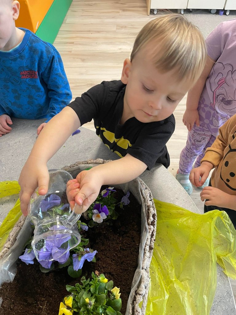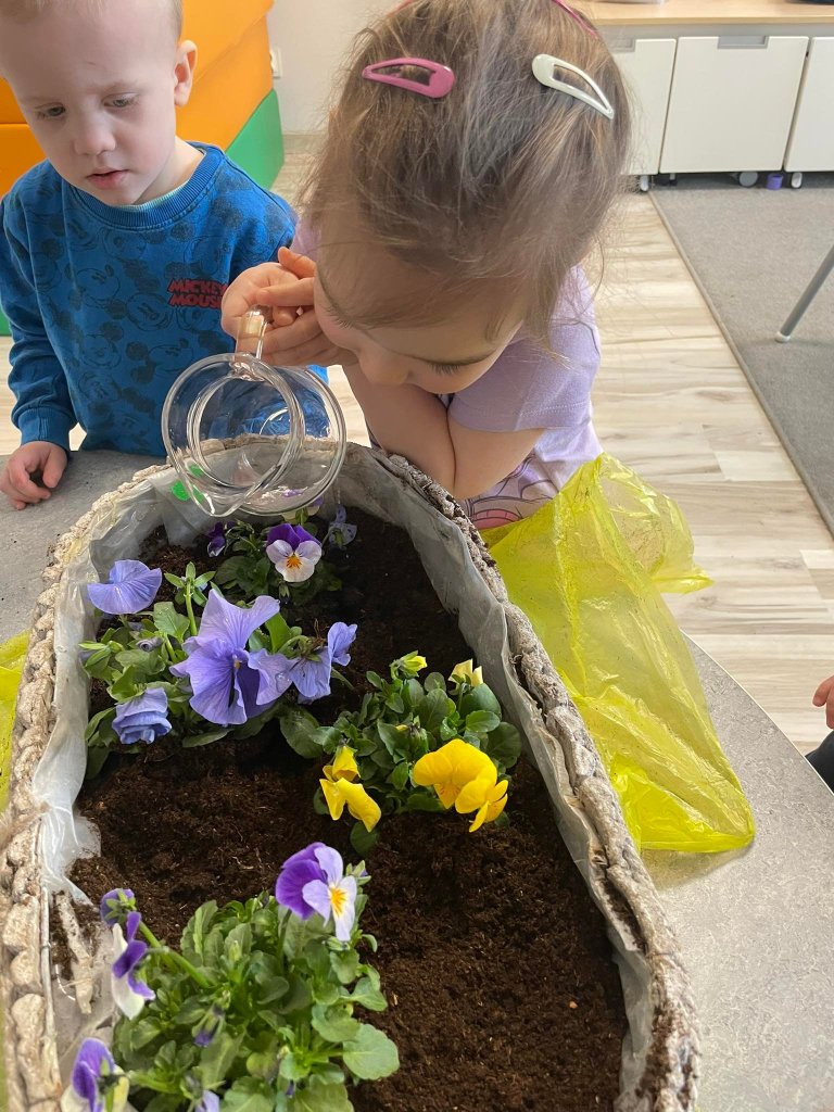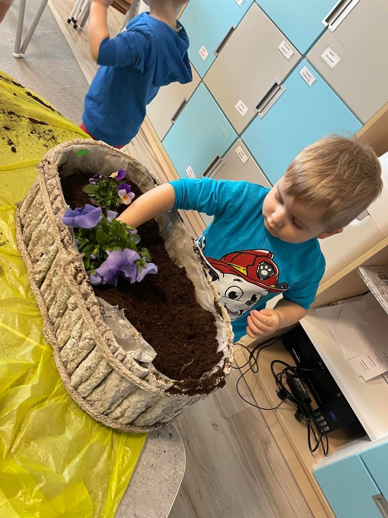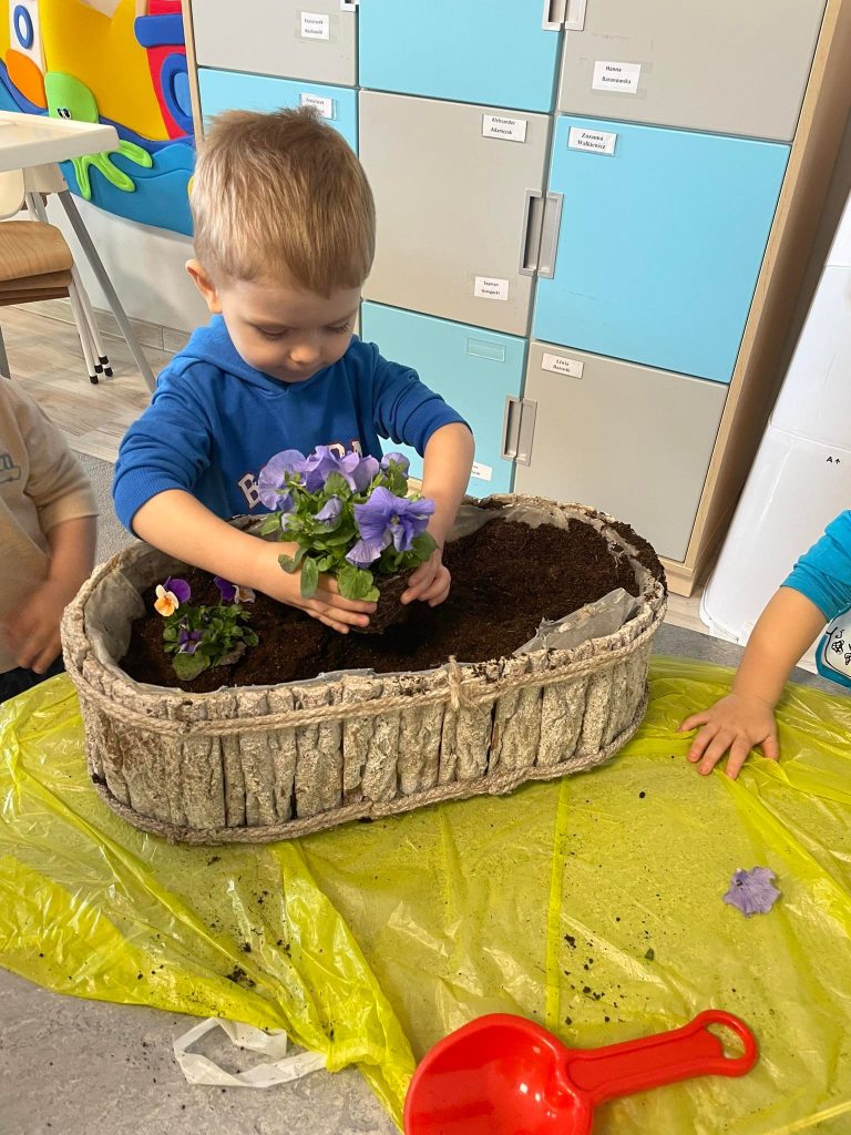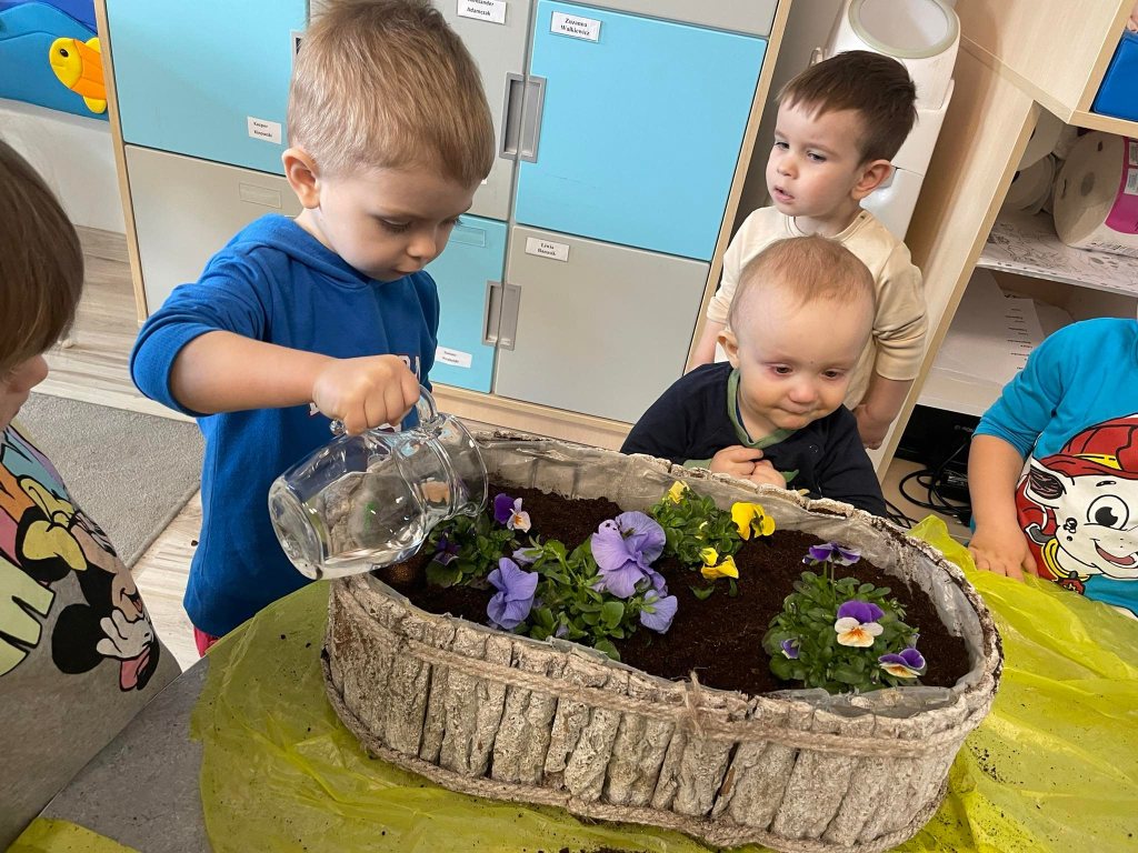 Dziś mali ogrodnicy wspólnie zasadzili bratki w ciągu kolejnych dni dzieci będą mogły je pielęgnować oraz obserwować efekty swojej pracy