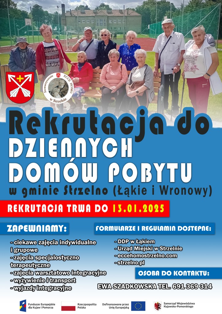 Nasze Stowarzyszenie podpisało umowę o dofinansowanie projektu pn. „Powstanie dwóch Dziennych Domów Pobytu w gminie Strzelno”. Projekt realizowany jest w ramach Priorytetu 8 Fundusze Europejskie na wsparcie w obszarze rynku pracy, edukacji i włączenia społecznego, w Działaniu FEKP.08.24 Usługi społeczne i zdrowotne.