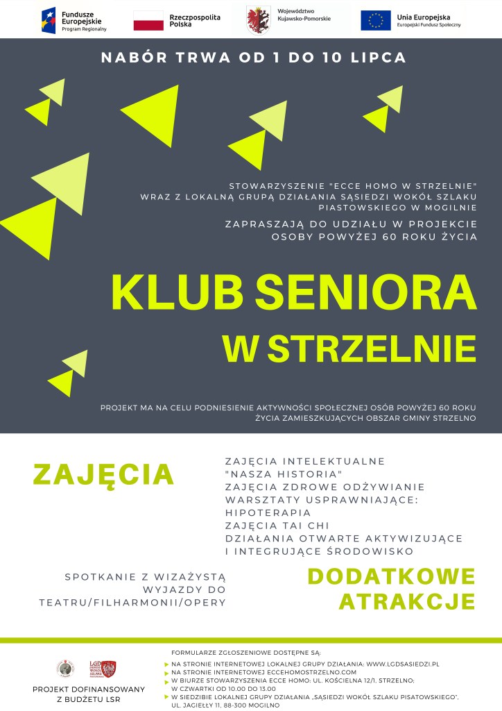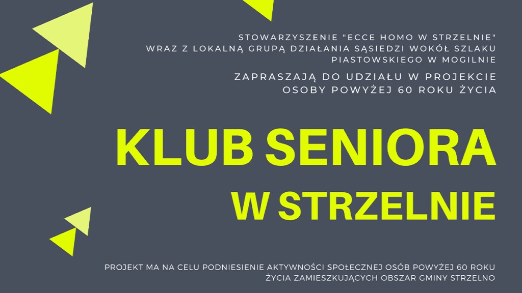 Stowarzyszenie „ECCE HOMO w Strzelnie” wraz ze Stowarzyszeniem Lokalna Grupa Działania Sąsiedzi wokół Szlaku Piastowskiego realizują projekt „KLUB SENIORA W STRZELNIE”.