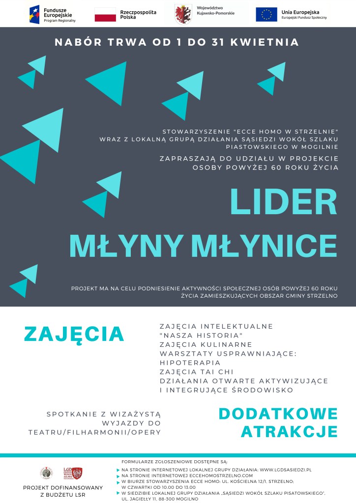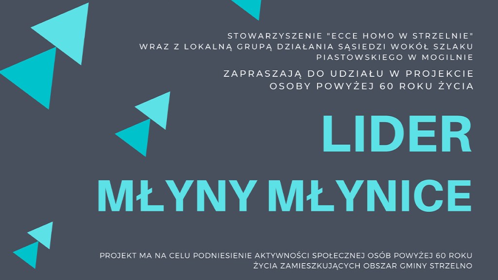 Stowarzyszenie „ECCE HOMO w Strzelnie” wraz ze Stowarzyszeniem Lokalna Grupa Działania Sąsiedzi wokół Szlaku Piastowskiego realizują projekt „LIDER MŁYNY MŁYNICE”.